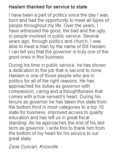 @BillHaslam that appeared in today's@knoxnews. I certainly agree with Zane on all that he wrote, and hope that readers of the Knoxville News Sentinel enjoy it as well. A copy of the Letter to the Editor is below.pic.twitter.com/Rf6ItrMNxr
