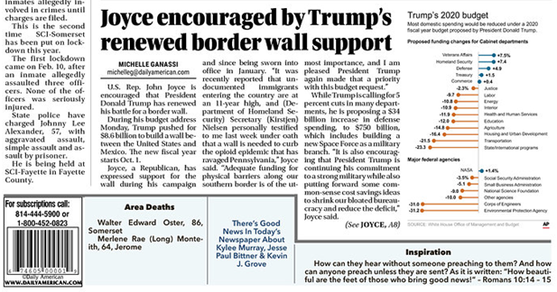Adequate funding for physical barriers along our southern border is of the utmost importance, and I am pleased President Trump again made that a priority. Read more on my reaction to the President's budget blueprint in the @dailyamerican → https://www.dailyamerican.com/news/local/somerset/joyce-encouraged-by-trump-s-renewed-wall-support/article_f49c8383-3000-5b0a-bda6-745bcd24270f.html …pic.twitter.com/S63Vbd07EK