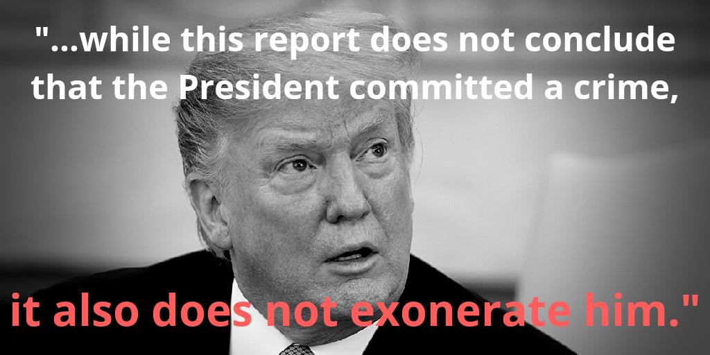 The report hasn't been released, only Barr's statement. It states that he hasn't been exonerated. Nice gaslighting.pic.twitter.com/KwIhfrnd0E