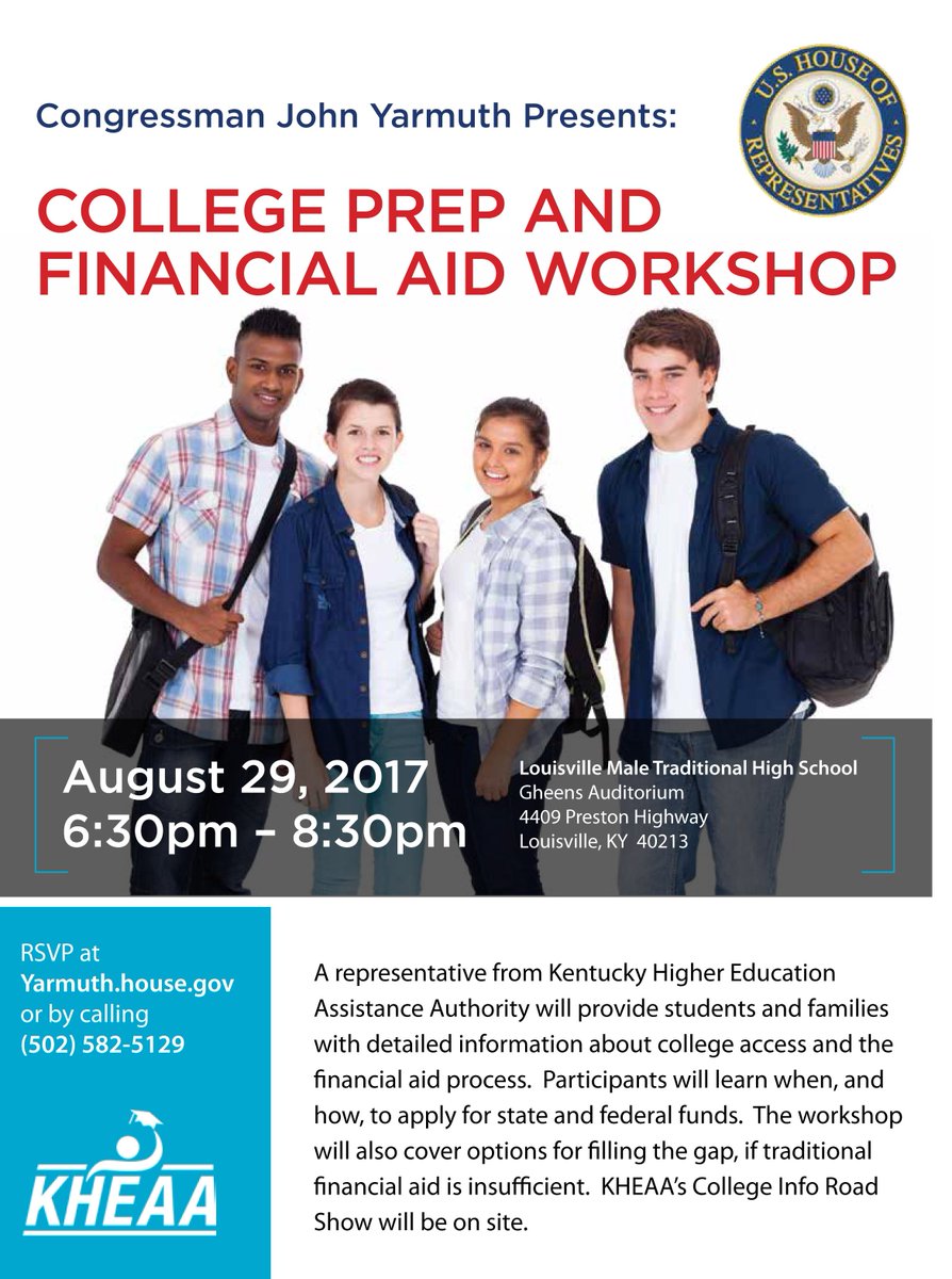 Join me for my College Prep and Financial Aid Workshop on 8/29 at 6:30pm in Gheens Auditorium at @LMHSInfo. RSVP at http://yarmuth.house.gov/rsvp .pic.twitter.com/iVTVTjKuTo