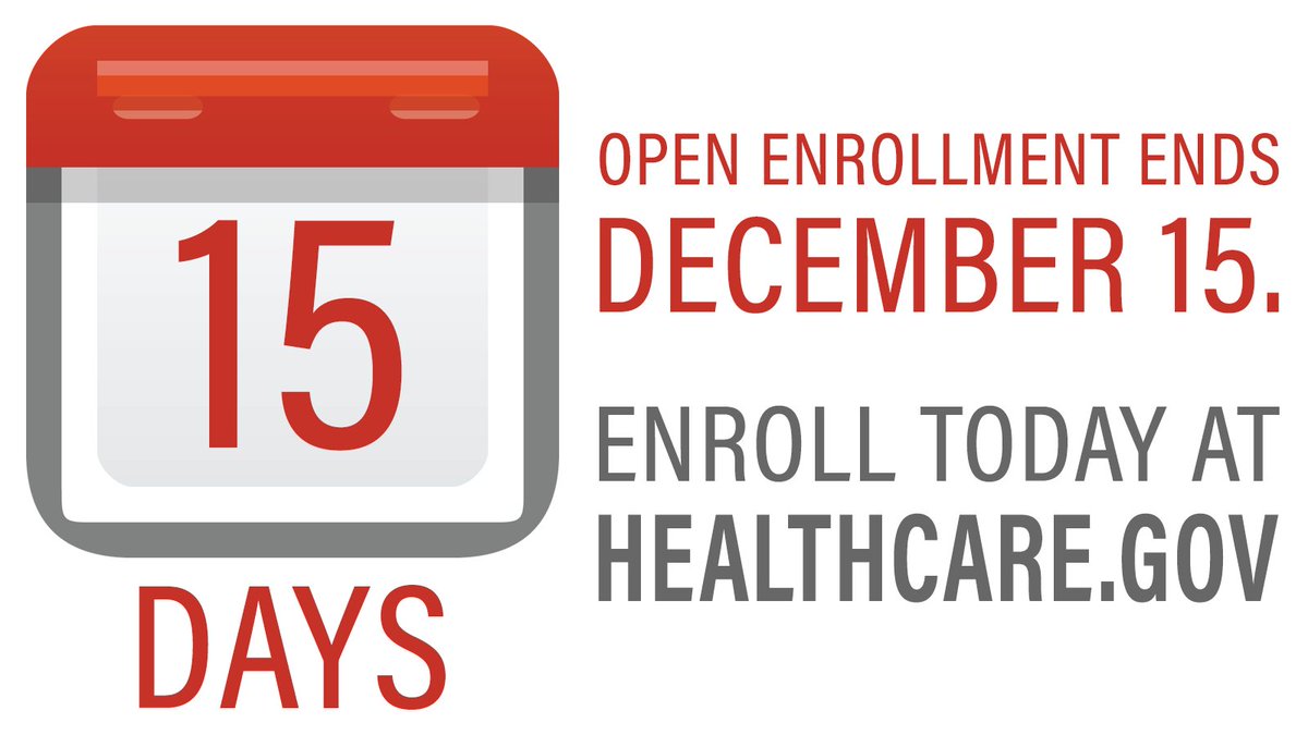 Open Enrollment for coverage in 2018 will end on Dec. 15. There are 15 days left, so head to http://www.HealthCare.gov  TODAY to find an affordable health care plan for you and your family.pic.twitter.com/DJVyEd5UnV