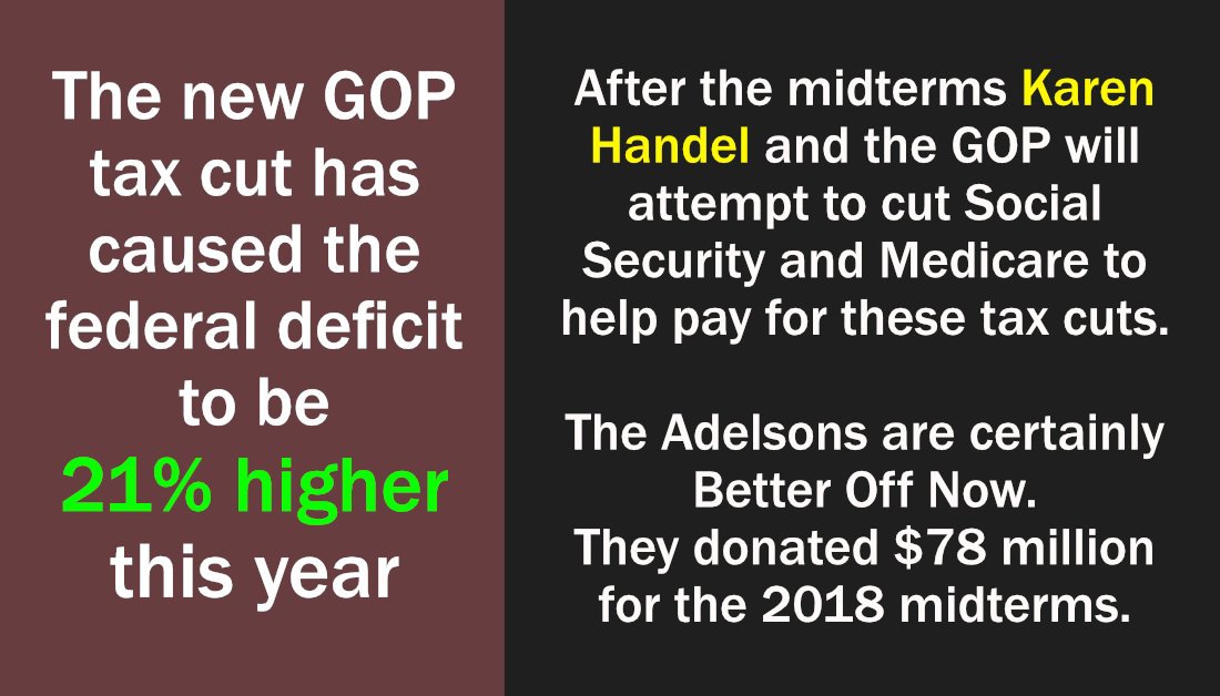 Tax cuts are certainly working for the Adelsons of Las Vegas, who are now saving $233 million EACH MONTH. Ironically, they helped fund those 'out of state money' ads last year that helped to elect Karen Handel, so she could vote for the big fat tax cut. Good investment for them!pic.twitter.com/DZpIvMYahT