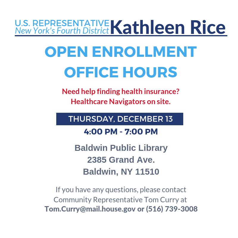 We're holding Mobile Office Hours on Thursday, December 13 at the Baldwin Public Library in #NY04! We'll be there from 4:00-7:00 PM. Come by for help getting covered during #OpenEnrollment! The deadline for January 1st coverage in NYS is December 15! Hope to see you there!pic.twitter.com/vJgquvSoFV