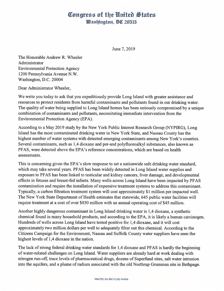 Today I sent a letter with my colleagues from the Long Island delegation to @EPAAWheeler regarding the alarming rates of water contamination in Nassau & Suffolk Counties.