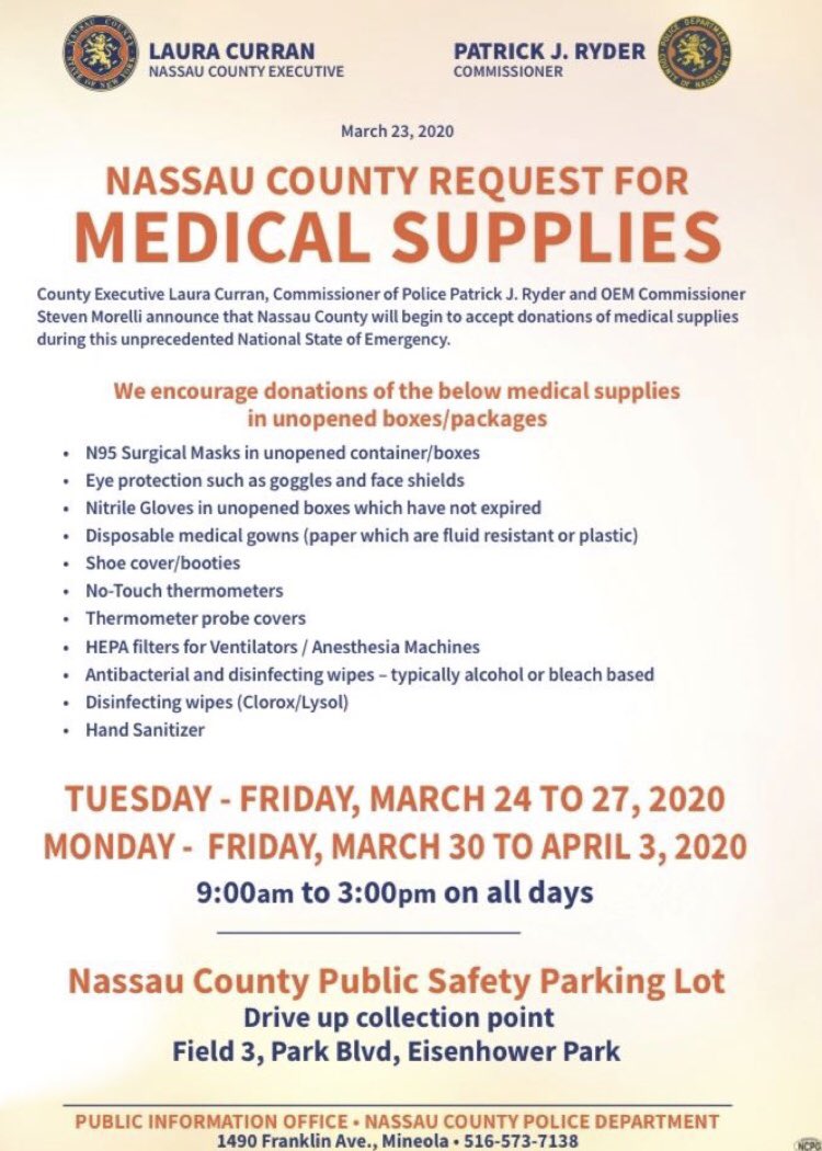 Nassau County is still accepting donations of medical supplies for local first responders and healthcare workers. More info below!https://twitter.com/NassauExecutive/status/1243274096772894720 …