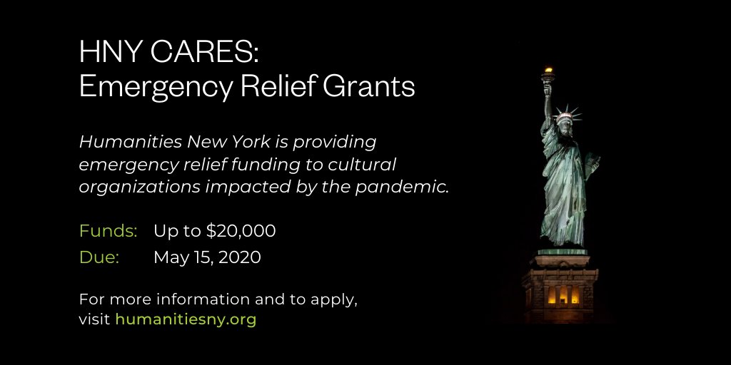 With funding from the CARES Act, @humanitiesny has announced 1 million dollars will be made available to 501(c)(3) humanities-related organizations, in the form of small grants up to $20,000. More information below. https://humanitiesny.org/our-work/emergency-grants/ …pic.twitter.com/jYGeGrUYGW