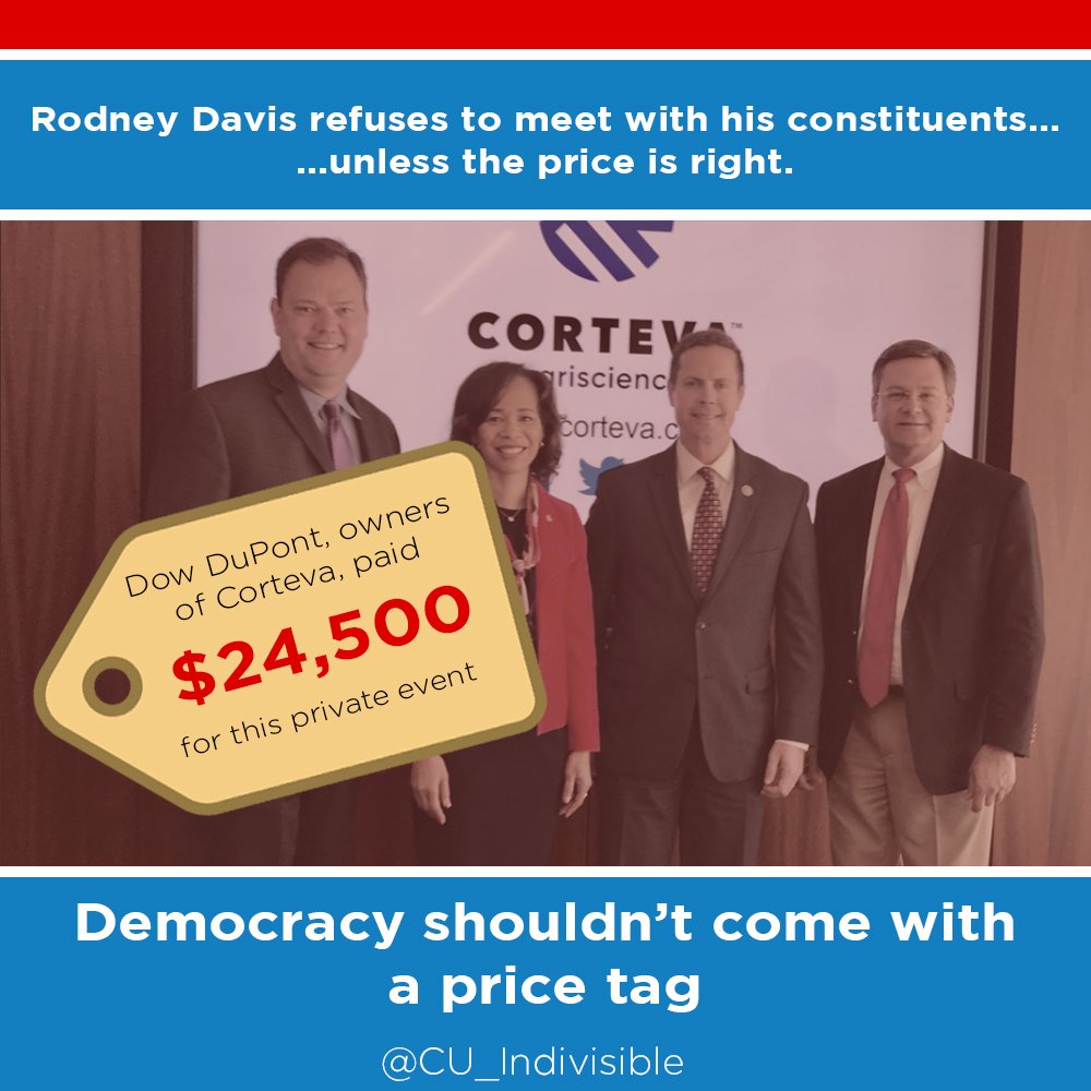 @RodneyDavis would give us the sort of time that he gives his donors. 75% of his money doesn't even come from#IL13, so we're not surprised to see he's visiting mega-donors@corteva, owned by@DowDuPontCo in Delaware while his actual district gets nothing.#paidtownhallspic.twitter.com/dByScxokMQ
