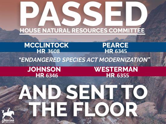 Members of the Western Caucus released statements regarding this week’s full committee hearing and markup on the Caucus’ bipartisan ESA modernization package, during which four of those bills passed the @NatResources Committee. #ModernizeESA Click here: https://bit.ly/2R36kGN  pic.twitter.com/qUtCL5JdEl