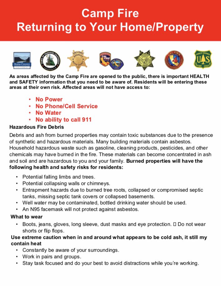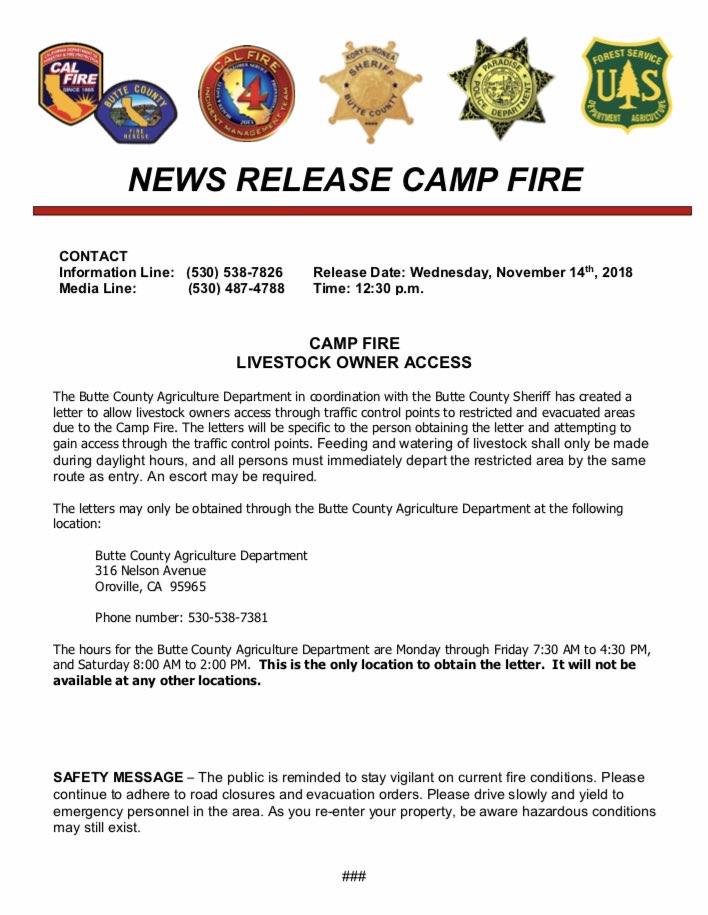 Important news release with new details on livestock owner access and returning to your home/property that has been affected by the #CampFire.pic.twitter.com/8rFgjGb8vA
