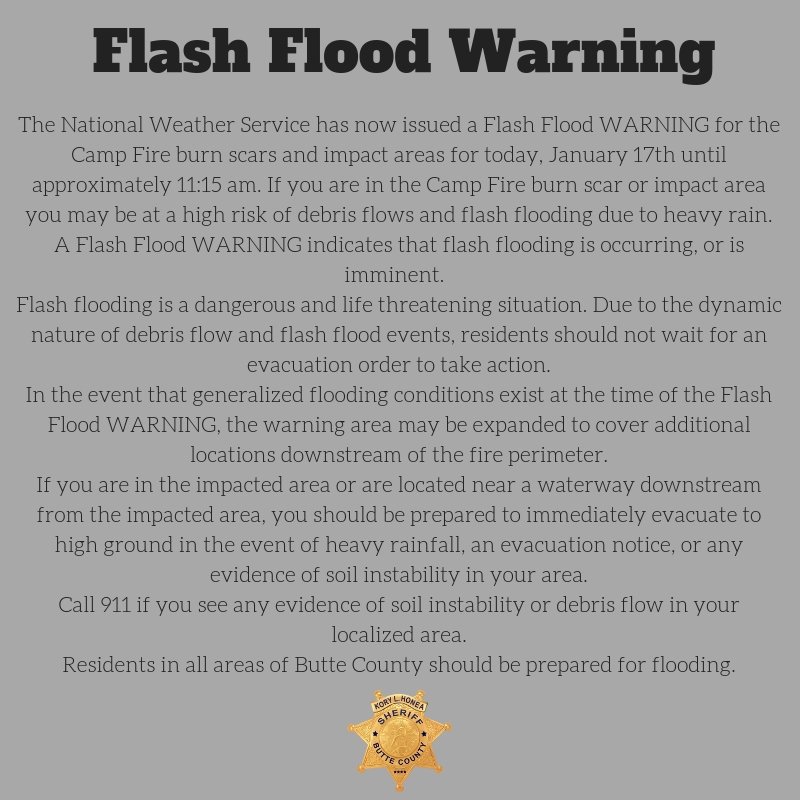 Be advised: the National Weather Service has issued a Flash Flood WARNING for the #CampFire burn scars and nearby areas.https://twitter.com/ButteSheriff/status/1085944637007704064 …