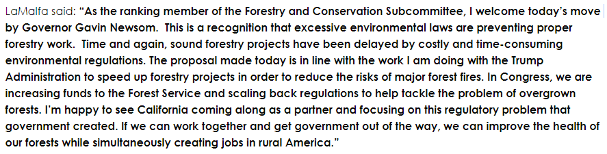 Today, Governor Gavin Newsom declared a state of emergency to waive environmental regulations and speed up forest management prior to the next wildfire season, allowing for the removal of dead trees. I welcome this move. Read my full statement--->https://bit.ly/2TV3mJB pic.twitter.com/pXnF6zKCeL