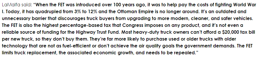 It's odd that you want to repeal a 12% excise tax that goes to the federal Highway Trust Fund when our highways are so overused & underfunded. How will you replace the $3 billion the tax generates? Oh, BTW, last year the tax generated $4.2 billion due to strong sales.