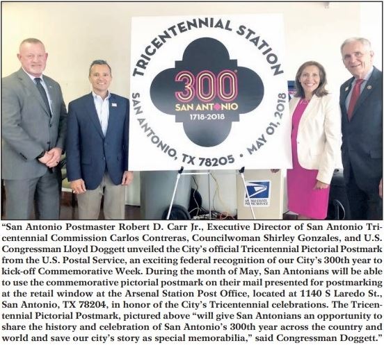 Through the month of May, a special Tricentennial postmark is available for San Antonians to use on mail presented for postmarking at the retail window of the Arsenal Station at 1140 S. Laredo St. Don’t let this month pass without obtaining your commemorative souvenir. #SA300pic.twitter.com/WepXhUN5wF