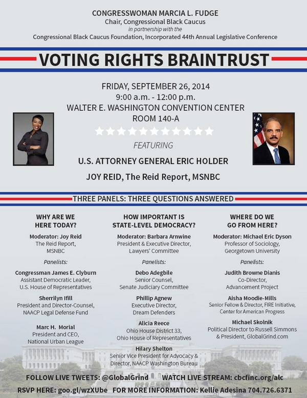 Voting Rights Braintrust Remarks: U.S. Attny Gen. Eric Holder Moderator: @JoyAnnReid Live Tweets: @GlobalGrindpic.twitter.com/dCmZYUHgyq