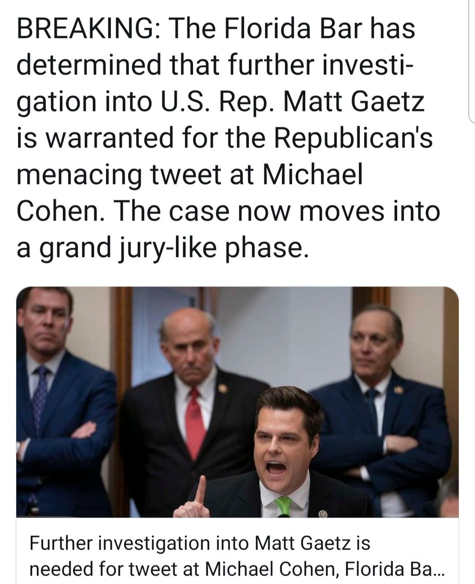 Rep. Matt Gaetz Is Facing An Ethics Investigation For Sending A Cryptic Threat To Michael Cohen https://www.buzzfeednews.com/article/kadiagoba/ethics-committee-matt-gaetz-threat-michael-cohen … via