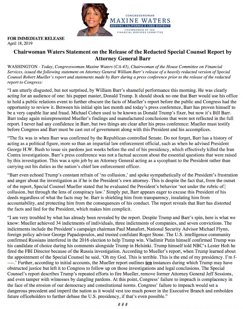 Barr auditioned for the job. He said he would protect Trump and that is what he has done. We demand Mueller's public testimony and review of his report NOT Barr's twisted interpretations!