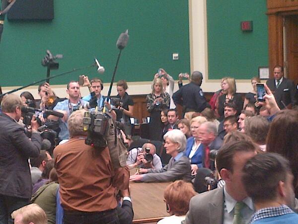 HHS Sec. Kathleen Sebelius arrives at E&C Committee hearing as members of the press surround her.pic.twitter.com/NnVAphjEsF
