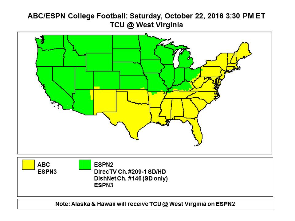 Today's game against TCU will air on ABC or ESPN2 depending on your location. Check out this map to see which channel to tune into. pic.twitter.com/q7mEB6hHrZ