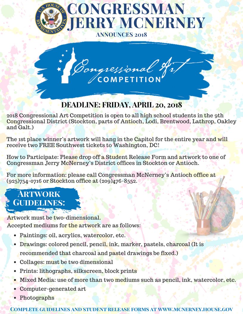 I'm excited to announce the 2019 Congressional Art Competition! If you're a high school student or know a high school student in the 9th Congressional District who has a passion for art, check out my website for more information on how to participate: https://mcnerney.house.gov/services/2019-congressional-art-competition …pic.twitter.com/EXQYsQy5wm