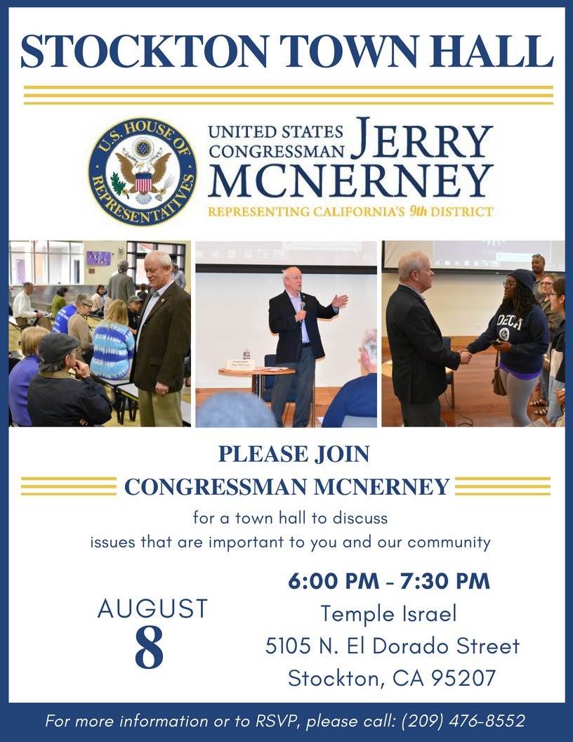 Looking forward to seeing everyone tonight! I'll be hosting a town hall from 6:00 PM - 7:30 PM at Temple Israel in Stockton. I'm excited to hear from you and to have a great discussion about the important issues and challenges facing our community and country.pic.twitter.com/IFi2Lt1JWV