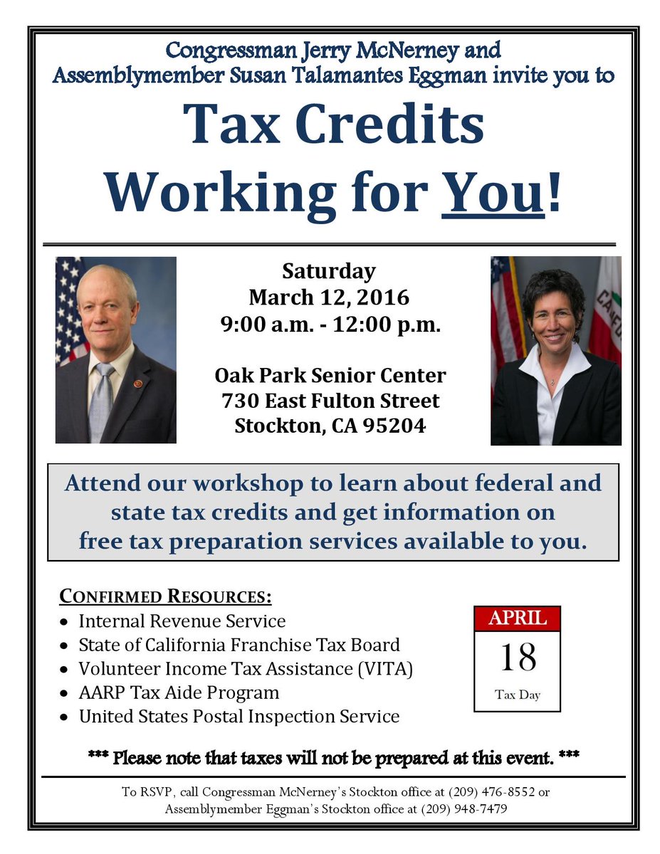 Before #TaxDay stop by my workshop on 3/12 to learn about tax credits & prep services. RSVP w/ my Stockton office.pic.twitter.com/wXF1EiwOfV