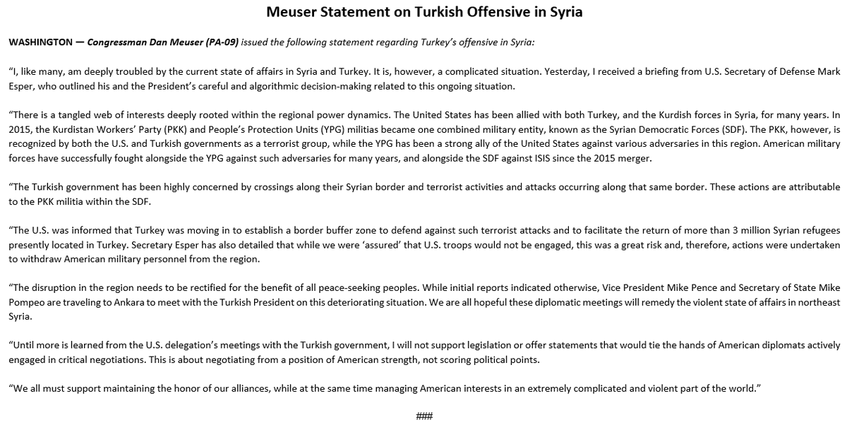 I am ashamed that 2 of my state representatives support the slaughter of the Kurdish people and the strengthening of our enemies' power. You wronged PA and America by voting nay today. Trump's shockingly bad decision will have dangerous repercussions for the world. Disgusting