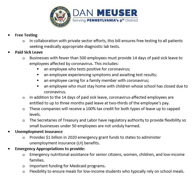 On Friday, the House passed H.R. 6201, the Families First Coronavirus Response Act. I voted in support of this legislation and have full confidence that it will be signed into law. While this legislation is not yet law, I wanted to share its main provisions:pic.twitter.com/LbEYrDaYZB