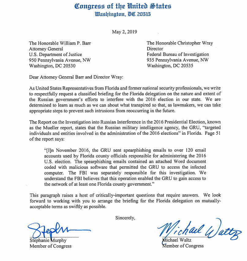 .@RepStephMurphy (D) and @RepMichaelWaltz (R), both former national security specialists at the Pentagon, send letter to AG Barr and FBI Director Wray on "the nature and extent of the Russian government’s efforts to interfere in Florida during the 2016 presidential election." pic.twitter.com/wGUb5ptyFc