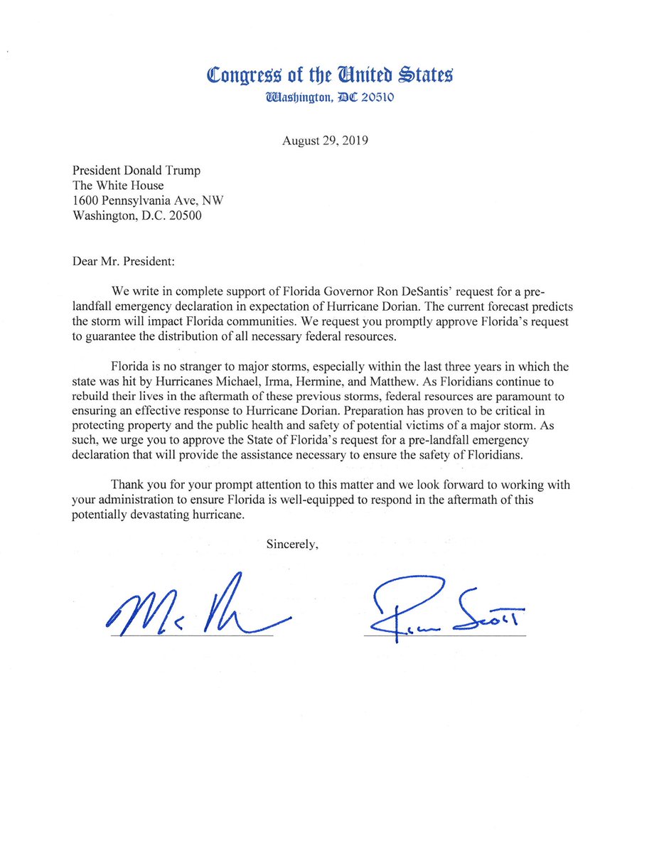 The Florida Delegation is united behind @GovRonDesantis' request for a pre-landfall disaster declaration for Hurricane #Dorian.
