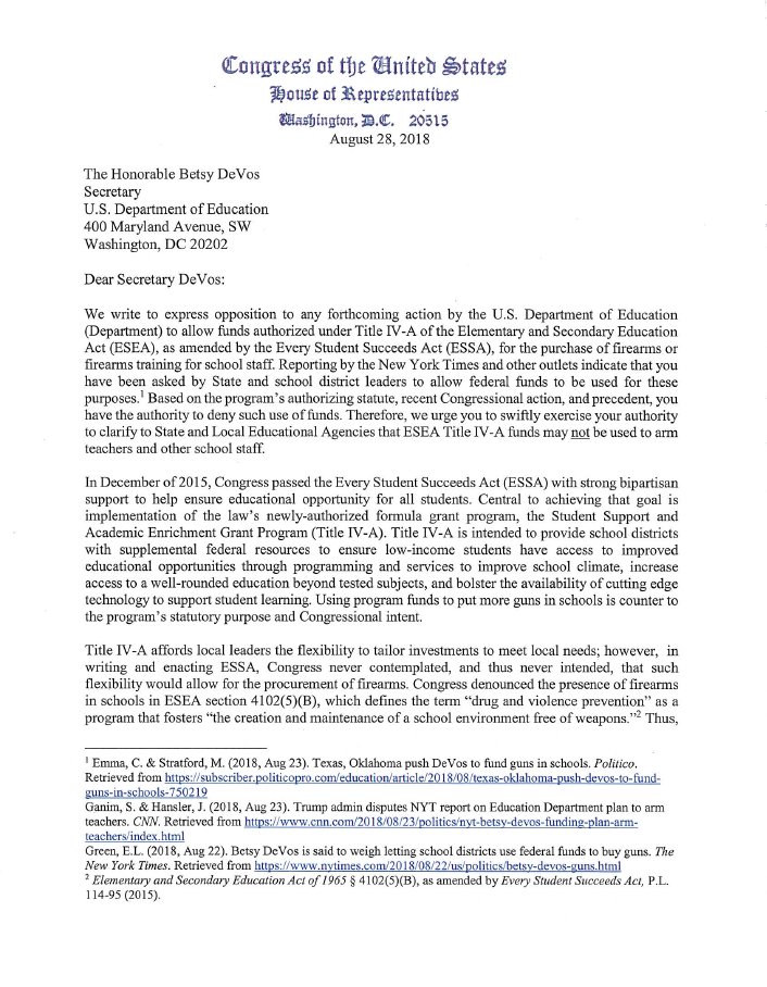 Proud to join 172 of my colleagues in sending a letter to @BetsyDeVosED expressing our outratge & opposition to the nonsensical idea that a federal grant program could be used to buy firearms for schools.https://twitter.com/dailykos/status/1033150491692285953 …