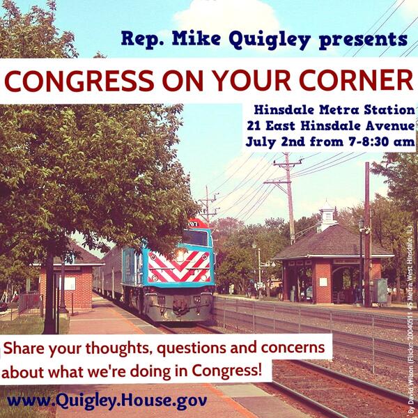 CONGRESS ON YOUR CORNER: Will be at #Hinsdale @Metra TMRW 7/2, 7-8:30 am! CC: @Doings_Hinsdale @HinsdaleChamberpic.twitter.com/OJvSElgyCC