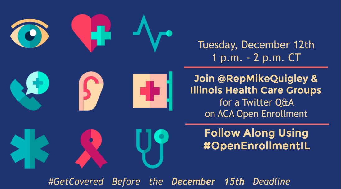 #OpenEnrollmentIL ends this week! On Tuesday, Dec. 12 at 1 pm CT, I'll be hosting a Twitter Q&A on the topic with #Illinois #healthcare groups & advocates. Follow along to learn how to sign-up & to share your own #ACA story.pic.twitter.com/zJGLDRq0qN