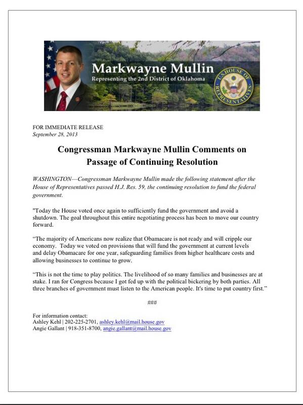 “@RepMullin: “Congressman Markwayne Mullin Comments on Passage of Continuing Resolution” pic.twitter.com/22mVnfQGuu”