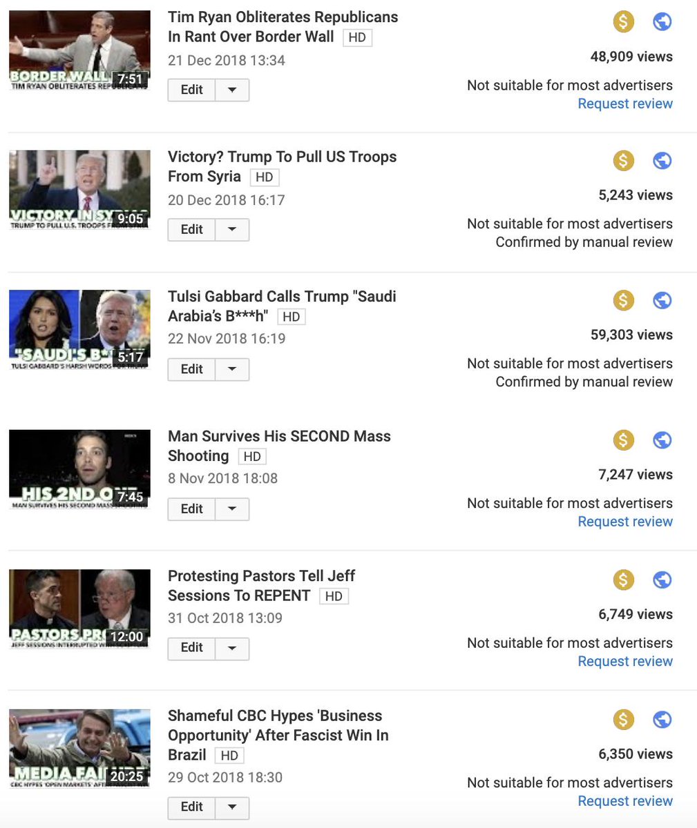 As a political YouTuber I'd like to spend more time debunking bigots, exposing hate, war, gun violence, rising fascism, etc.. but when I do (after hours/days of work) @TeamYouTube demonetizes it. We should demand better. Recognizing what's educational vs. harmful isn't tough.pic.twitter.com/VYNSxcmFoQ