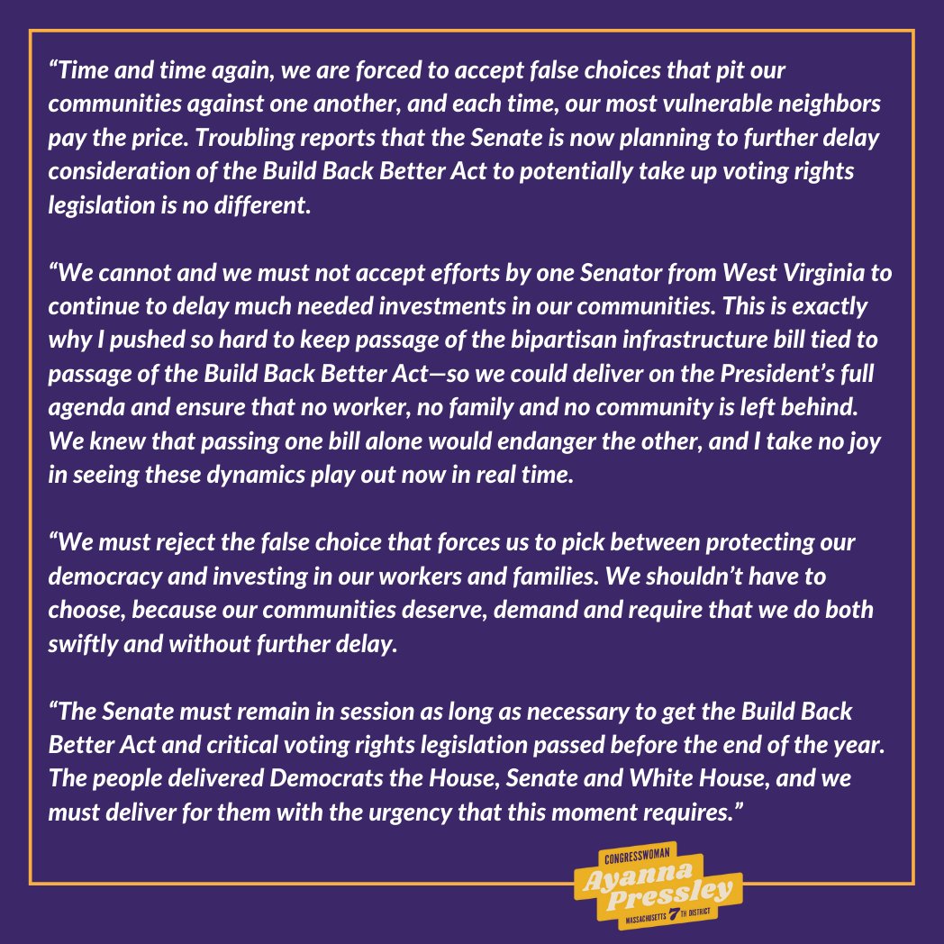 #BuildBackBetter & I take no joy in seeing this play out in real time. The Senate must stay in session to pass the Build Back Better Act & voting rights legislation before the end of the year. My full statement: https://pressley.house.gov/media/press-releases/pressley-urges-senate-stay-session-pass-build-back-better-voting-rights …pic.twitter.com/hCY1Aqq47J
