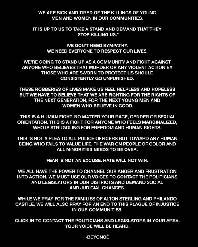 #PhilandoCastile #AltonSterling #BlackLivesMatter. Thank you @Beyoncepic.twitter.com/lmo4LQtJ28