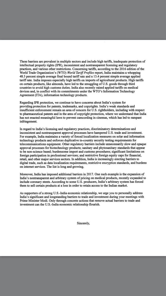 .@RepKevinBrady @senorrinhatch @RonWyden and I are urging the President to address US-India trade barriers during PM Modi’s visit.pic.twitter.com/iLe0pWnLPe