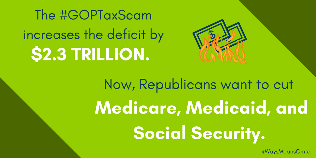 Tax cuts don't pay for themselves. So how do Republicans want to pay for the #GOPTaxScam? By cutting crucial benefits like #Medicare, #Medicaid, and #SocialSecurity.pic.twitter.com/XBzja36iSl