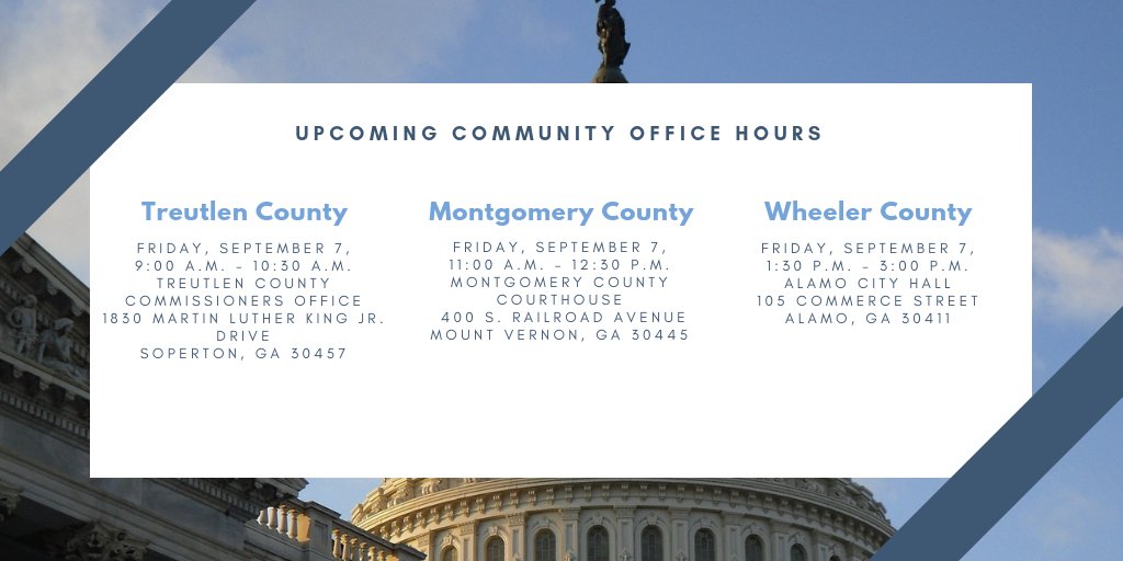 #GA12 REMINDER - September Community Office Hours continue tomorrow in Treutlen, Montgomery, and Wheeler counties. For the full list of dates and locations, please click here → https://bit.ly/2s0iFkN pic.twitter.com/ZFsI0BPjL0