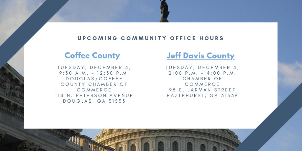 #GA12 REMINDER - Members of my staff will be kicking off December Community Office Hours tomorrow and will be available in Coffee and Jeff Davis counties. If you need assistance with a federal agency, I strongly encourage you to stop by! Full list here → https://bit.ly/2s0iFkN pic.twitter.com/y1sJ9xJPLv