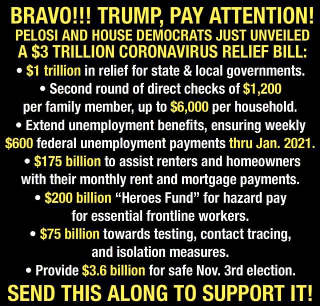 The Fed Chair said yesterday that bold spending is needed to prevent tragic economic conditions ahead. McConnell said he would wait. Thanks to Speaker Pelosi and the Democrats for putting forth a proposal to start a dialogue with Republicans and the Administration.