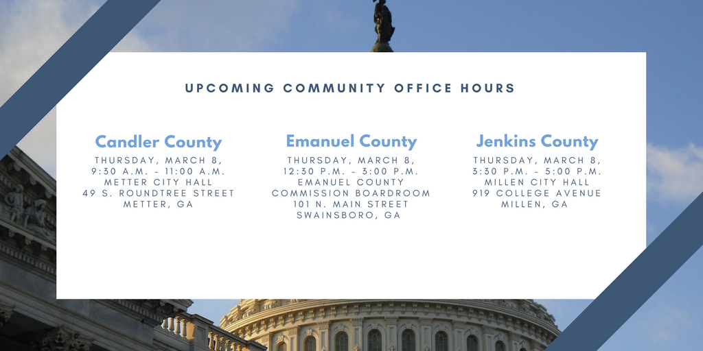 #GA12 REMINDER - My staff will be in Candler, Emanuel, and Jenkins counties tomorrow for Community Office Hours. For the full list of dates and locations please click here → http://bit.ly/2s0iFkN .pic.twitter.com/tR3phdrpfY