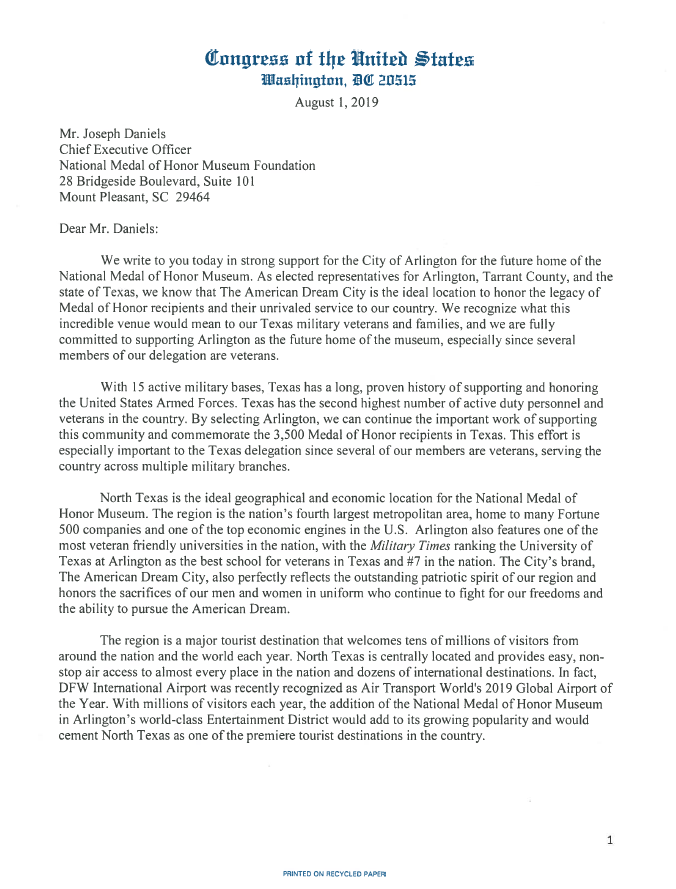 Grateful for such strong support for the National Medal of Honor Museum and thankful for the leadership of @RepVeasey and @RepKayGranger to have it placed in Arlington Texas!https://twitter.com/RepVeasey/status/1159567920265158661 …