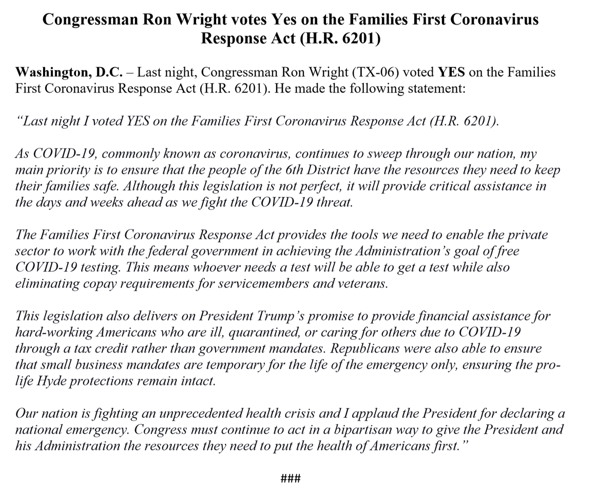 Last night I voted for the Families First Coronavirus Response Act that will provide assistance in the days & weeks ahead as we fight COVID-19. Although it was not perfect, I am proud the House & @POTUS were able to come to a bipartisan solution. My full statement ⤵pic.twitter.com/lR6TwxZ4aO