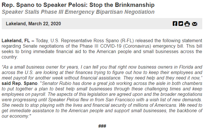 Thank you @RepRossSpano for standing up for your district, your state, and our great country. #notimeforpolitics.