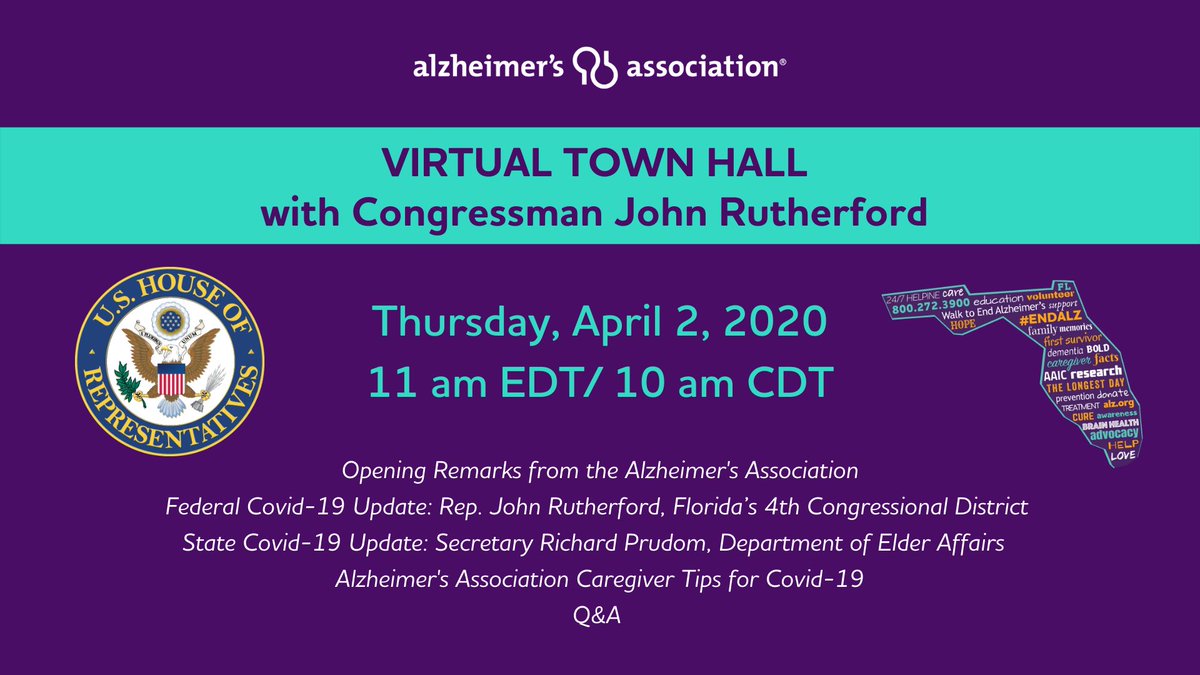 The Alzheimer's Assoc. is partnering with @RepRutherfordFL and @elderaffairs Sec. Richard Prudom, to host our first-ever Virtual Town Hall! To register for this event, please use this link. #alzFL #ENDALZ https://primetime.bluejeans.com/a2m/register/ezvqdyre … pic.twitter.com/c91y9VGbME