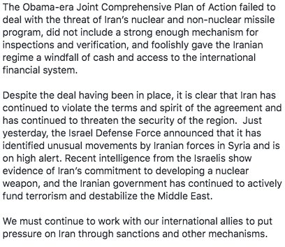 1/The IAEA teams reported on Feb 2018 that Iran is following the preagreed deal. Easy Google search: https://www.iaea.org/newscenter/focus/iran/iaea-and-iran-iaea-reports … No idea what they told u to issue out this statement but "other measures"?.. The "Israelis" r sounding the alarm? Do you not understand that...