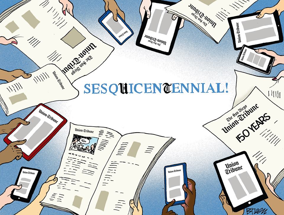 Tomorrow is the 150th birthday of the @sdut, San Diego's oldest business. ONE HUNDRED AND FIFTIETH! Be sure to pick up a copy tomorrow for a special pullout section commemorating the big day in a cool way. And thank you for your readership all these years. pic.twitter.com/Kl45amYlKQ