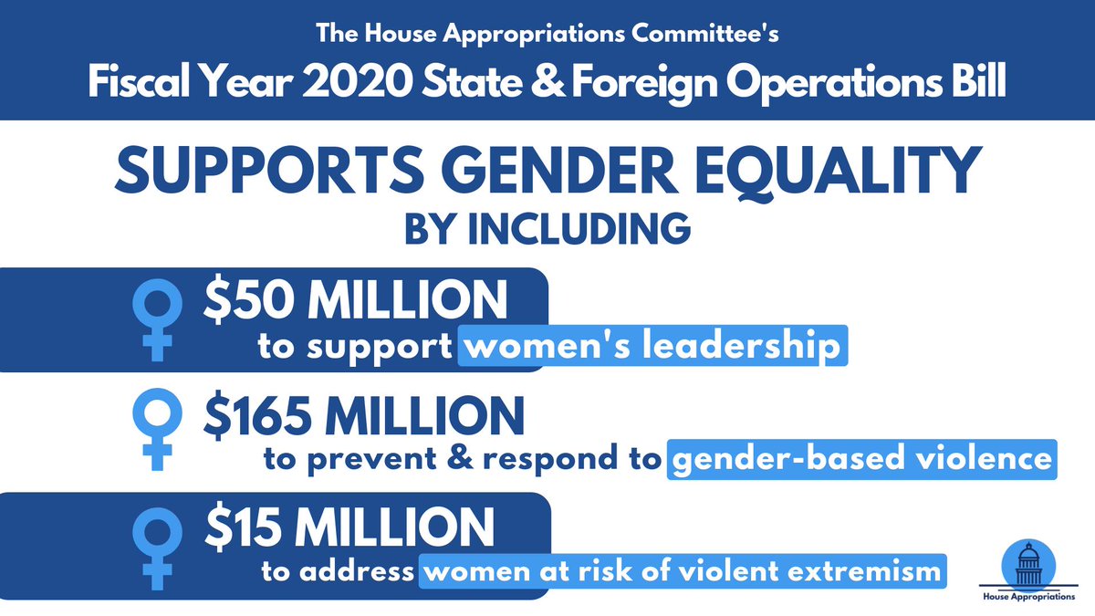 The FY 2020 State and Foreign Operations bill rejects harmful #TrumpBudget cuts & makes necessary investments to empower women & girls around the world, including in reproductive rights & women’s leadership.