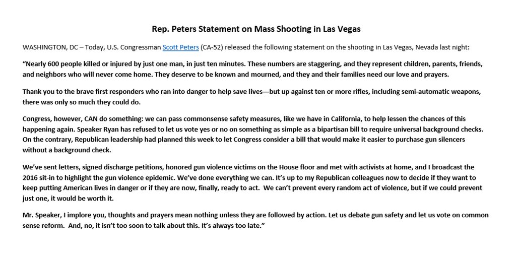 Rep. Scott Peters@RepScottPetersMy full statement on the #LasVegas tragedy: http://bit.ly/2hJ87DI9:14 PM · Oct 2, 20178 Retweets2 Quote Tweets16 Likes